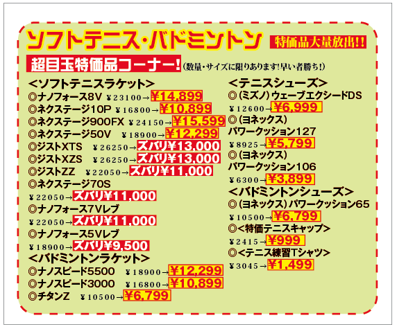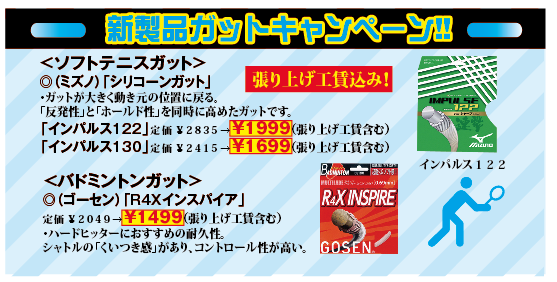 「新製品ガットキャンペーン」も開催!「超目玉特価品コーナー」は超お買い得価格で大量放出!!