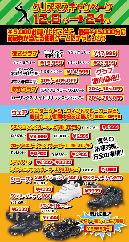 ◎アンダーシャツ・ウィンドブレーカーなど、野球ウェア期間中全品定価より20%OFF!!